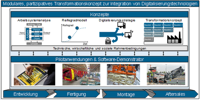 Das Ziel von InAsPro ist die Entwicklung eines generischen Transformationskonzepts zur Implementierung von Digitalisierungstechnologien in Arbeitssystemen entlang der Produktlebenszyklusphasen Entwicklung, Fertigung, Montage und Aftersales. Hierbei werden die Dimensionen Mensch, Technik und Organisation berücksichtigt. Die reifegradbasierten, modularen Digitalisierungsbausteine werden entlang des Produktlebenszyklus mit Digitalisierungsstrategien verknüpft und die Bausteine in einem generischen, modularen Transformationskonzept zusammengefasst. Das Transformationskonzept hat zusätzlich zum Ziel die Kompetenzen der Mitarbeiter hinsichtlich Digitalisierung zu erweitern.